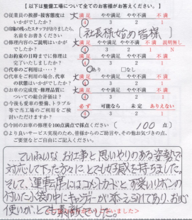 ていねいなお仕事と思いやりのある姿勢で 対応して下さった方々に、とても好感を持ちました。 そして運転席にはコメントカードと 可愛いリボンの付いた小袋の中に キャンディが添えられてあり、 お心使いがとても素敵でした。 20 ...