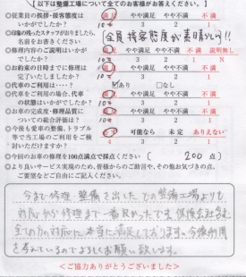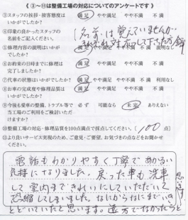 今までの修理・整備を出したどの整備工場よりも 対応から修理まで一番良かったです。 保険会社含む全ての方の対応に本当に満足しております。 今後の利用を考えているのでよろしくお願いします。 2014.07.27 ...