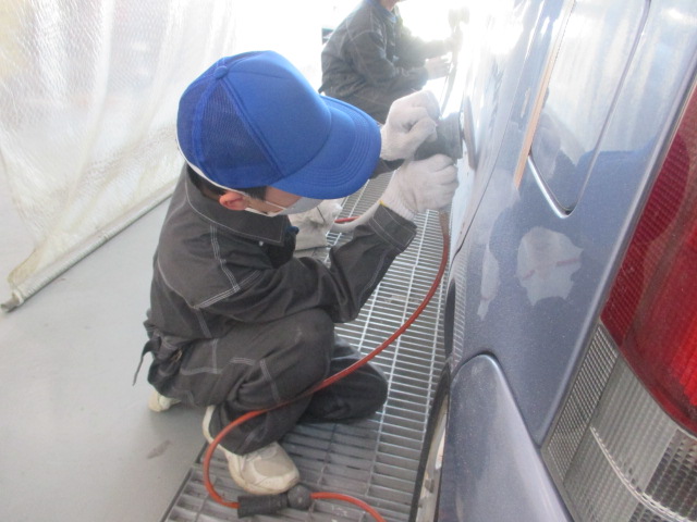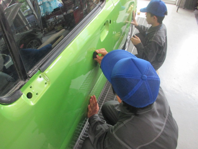 途中、プロとしての腕の違いをみてもらうために、スタッフが塗装した一部をしっかりと磨いて見せ、例年通りならここで生徒の皆さんが「おー!!」という感動する声が聞こえるところですが、今回は明るい色だったのでプロの仕事が伝わりにくく、担当したスタッフが残念そうでした・・・ 😆